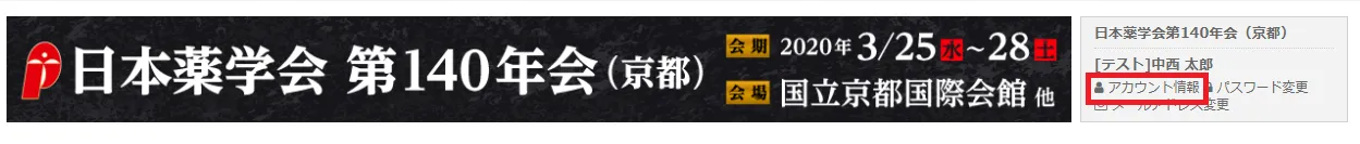 A:発表者情報はアカウント情報と連携しています.発表者名を変更いただく場合には,登録システムトップ画面右上の【アカウント情報】をクリックいただき,登録内容をご修正ください.アカウント情報を修正いただきましたら,演題画面にて発表者名も自動修正されていることをご確認ください.