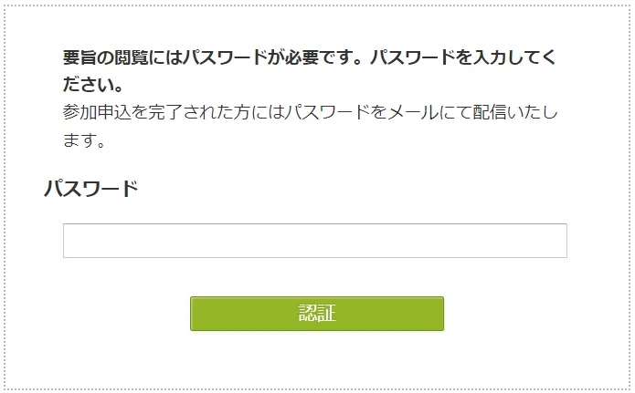 上記①~④いずれかの方法で表示された個々の講演タイトルをクリックすると、当該の講演情報とパスワード入力画面が表示されます。