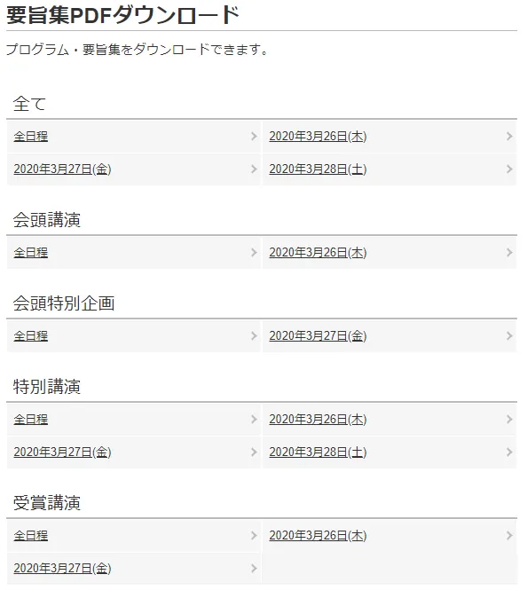 また左メニュー【要旨PDFダウンロード】よりセッション・日付別のプログラム・要旨PDFがダウンロードできます。
