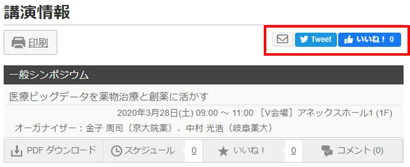 セッション情報や講演情報を各SNS(メール、Twitter、Facebook)へ共有することができます。