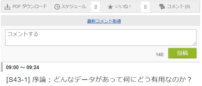 セッション詳細、講演詳細画面で講演へのコメントを投稿できます。
