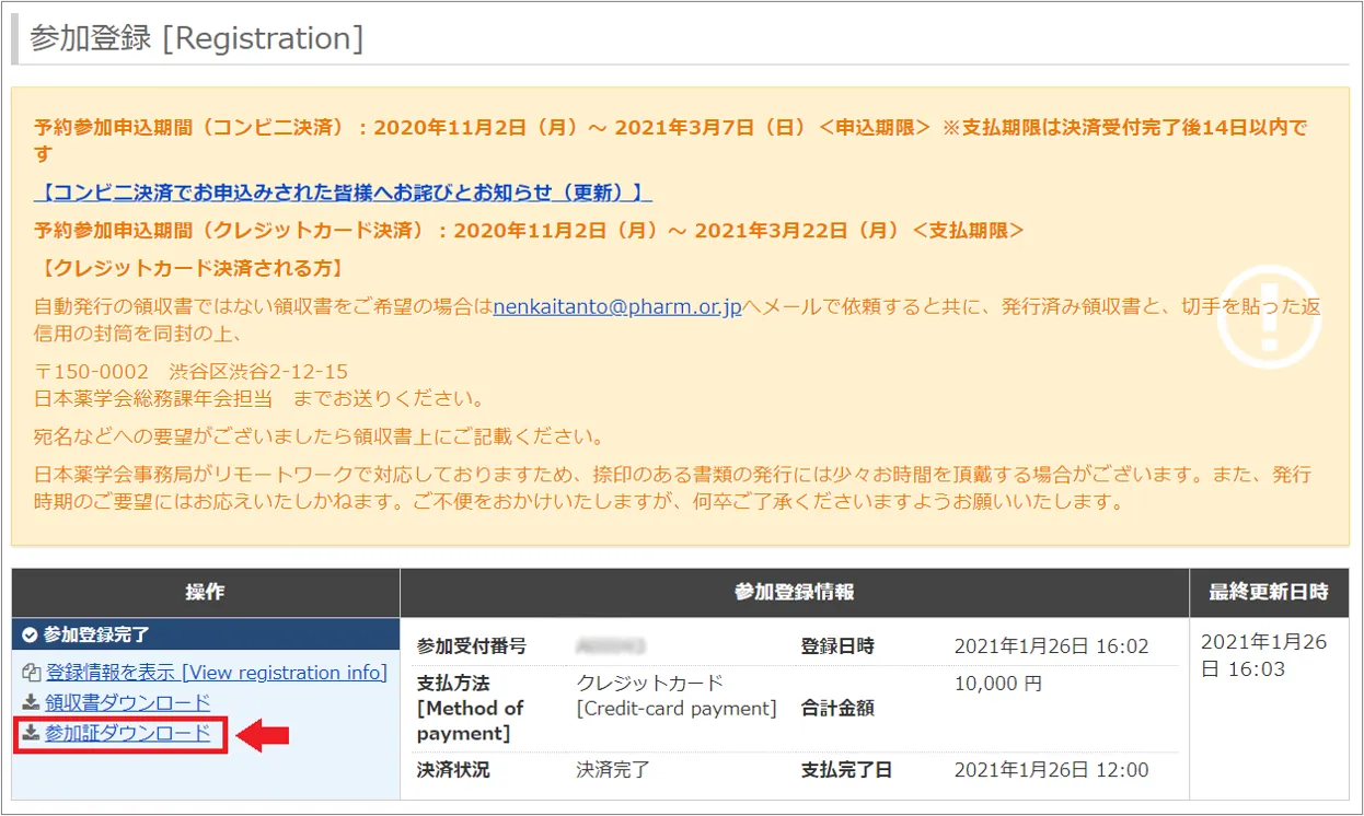 【手順2】参加登録 [Registration] の【参加証ダウンロード】をクリック
