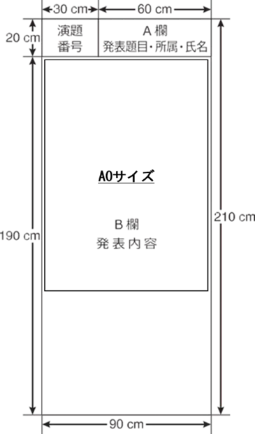 (b) A 欄に発表題目,所属,氏名 (発表者に〇印をつける),B欄に発表内容 (A0サイズ) を記してください.ポスター作製は,ポスター作成マニュアルを参照しテンプレート (用紙サイズ: 90 cm × 140 cm) をご使用ください.当日に掲示する紙媒体のポスターにはWEB版 (ポスター発表用PDFファイル) に情報を追加して頂く事も可能です.