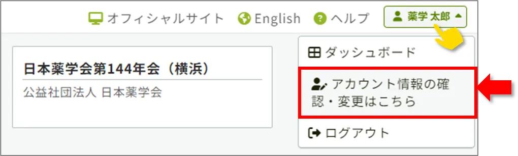 A:発表者情報はアカウント情報と連携しています.発表者名を変更いただく場合には,登録システムトップ画面右上の氏名ボタンから【アカウント情報の確認・変更はこちら】をクリックいただき,登録内容をご修正ください.アカウント情報を修正いただきましたら,演題画面にて発表者名も自動修正されていることをご確認ください.