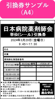 単位対象セッションの開始時間前に総合受付(展示ホール)で引換券を配布します.引換券には❶氏名❷所属➌薬剤師名簿登録番号❹参加した3つのセッションのセッションの番号➎各セッションのパスコードをご記入ください.パスコードはセッション終了時,各セッション会場の出入口付近に掲示します.3つ目のセッション終了後,総合受付(展示ホール)に引換券をお持ちになり,研修単位シールと交換してください.単位への交換は,参加したセッションの当日のみ有効です (後日の交換はできません).セッション開始から予定終了時間まで,途中で退出や移動をせず聴講してください.既定の聴講時間に満たずに退室した場合は,受講したと認められません.