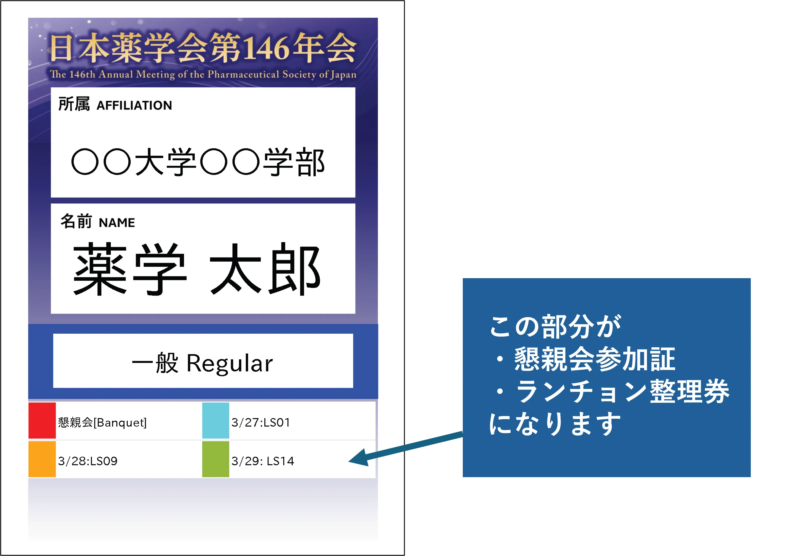 懇親会、ランチョン・キャリアデザインセミナーに申込された方には、参加証に印字されます。