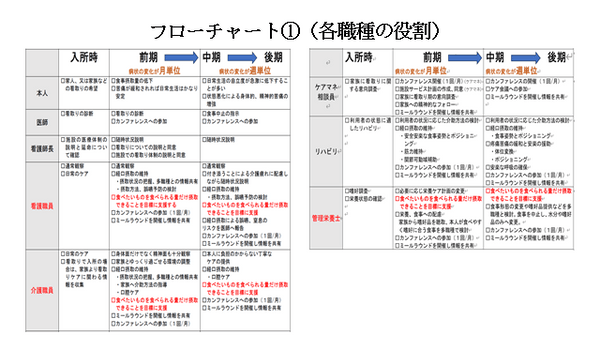 3.アンケート結果を分析し、各職種の思いや課題を明確化した上で、チームで検討会を開催。多施設の取り組みや看護協会の文献を参考に、「入所時」「前期」「中期~後期」の3段階に分類し、各時期における職種別の対応を明文化し、フローチャートを作成した。