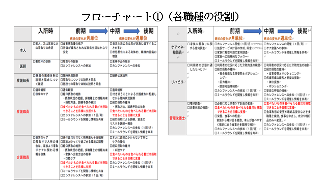 作成したフローチャートにより、食事ケアの流れや職種間の連携方法を視覚的に明確化することができた。(図1参照)