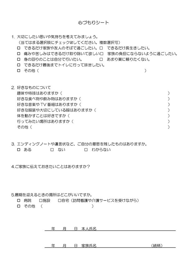 家族間で話し合えていなかった事がわかって良かった。看取りケア説明時に「心づもりシート」を見せて頂き納得する同意だった。本人の考えと自分達の考えが一致していた。良い取り組みなので今後も続けて頂きたい。