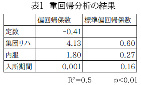 入所時のBPSD25Qの重症度の平均は7.76±5.46、退所時のBPSD25Qの重症度の平均は5.27±3.76であった。集団リハの参加利用者は10名であり、積極的な参加のみられなかった利用者や拒否された利用者は除外した。認知症治療薬または睡眠障害改善薬を内服している利用者が22名、平均入所期間は304.1日間であった。BPSD25Qの重症度の入退時の変化を目的変数として、重回帰分析により解析した結果を表1に示した。定数-0.41、偏回帰係数はそれぞれ集団リハの有無が4.13、認知症治療薬または睡眠障害改善薬の内服の有無が1.80、入所期間が0.001であった。標準偏回帰係数はそれぞれ集団リハの有無が0.60、認知症治療薬または睡眠障害改善薬の内服の有無が0.27、入所期間が0.16という結果であった(p<0.01、R2=0.5)。BPSD25Qの入退所時の変化には、集団リハが最も影響を与えており、入所期間は最も影響が小さかった。