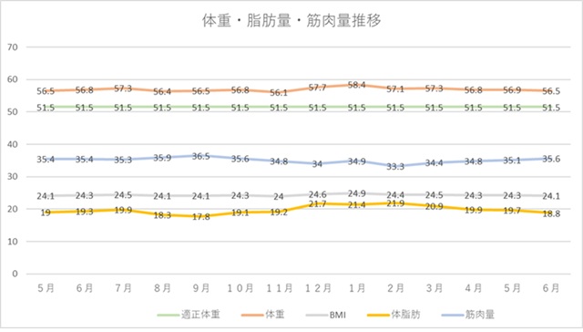 食事に関してもサポート的に関わることで、栄養に対する高い意識と主体性が発揮され、さらに充実した自己管理のもと体組成の維持ができたと考える。
