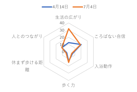 E-sasの結果から、生活の広がりが大幅に改善されたことは、ご家族と買い物に出ることや外出する機会が格段に増えたからだと考える。デイケアご利用中に実際に近隣のホームセンターへ外出訓練を行い、その結果をご家族へ当日の様子を写真に現像しフィードバックしたため、本人だけでなくご家族の外出への自信につながったのではないかと考える。