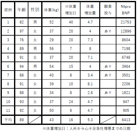50床の老健で1年6か月の間に心不全の急性増悪が11例に見られた。そして、心不全の急性増悪は入所後40日以内に起こっていた。施設入所後に急に多量の水分を取るようになったことが、心不全の急性増悪の一因ではないかと推測された。