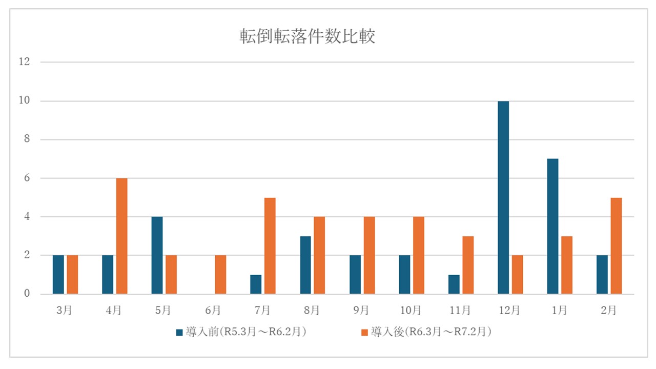 図は見守りセンサー導入前後で転倒・転落件数を比較したグラフである。青いグラフは導入前(R5年3月~R6年2月)の転倒件数であり、12月、1月は当施設で新型コロナウィルスのクラスターがあり、転倒件数が増加した。茶色グラフは導入後(R6年3月~R7年2月)であり4月に多いのはインフルエンザの流行が原因だった。導入前後で件数に有意差は見られなかった。