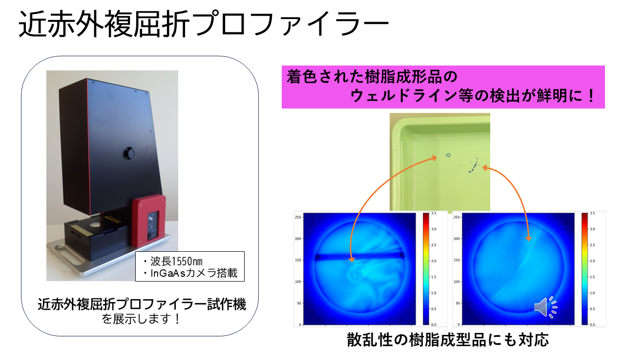 題目:近赤外複屈折プロファイラーのご紹介 内容:樹脂成形の過程で生じる高分子の配向による複屈折分布をイメージングする”複屈折プロファイラー”の近赤版のご紹介です。
