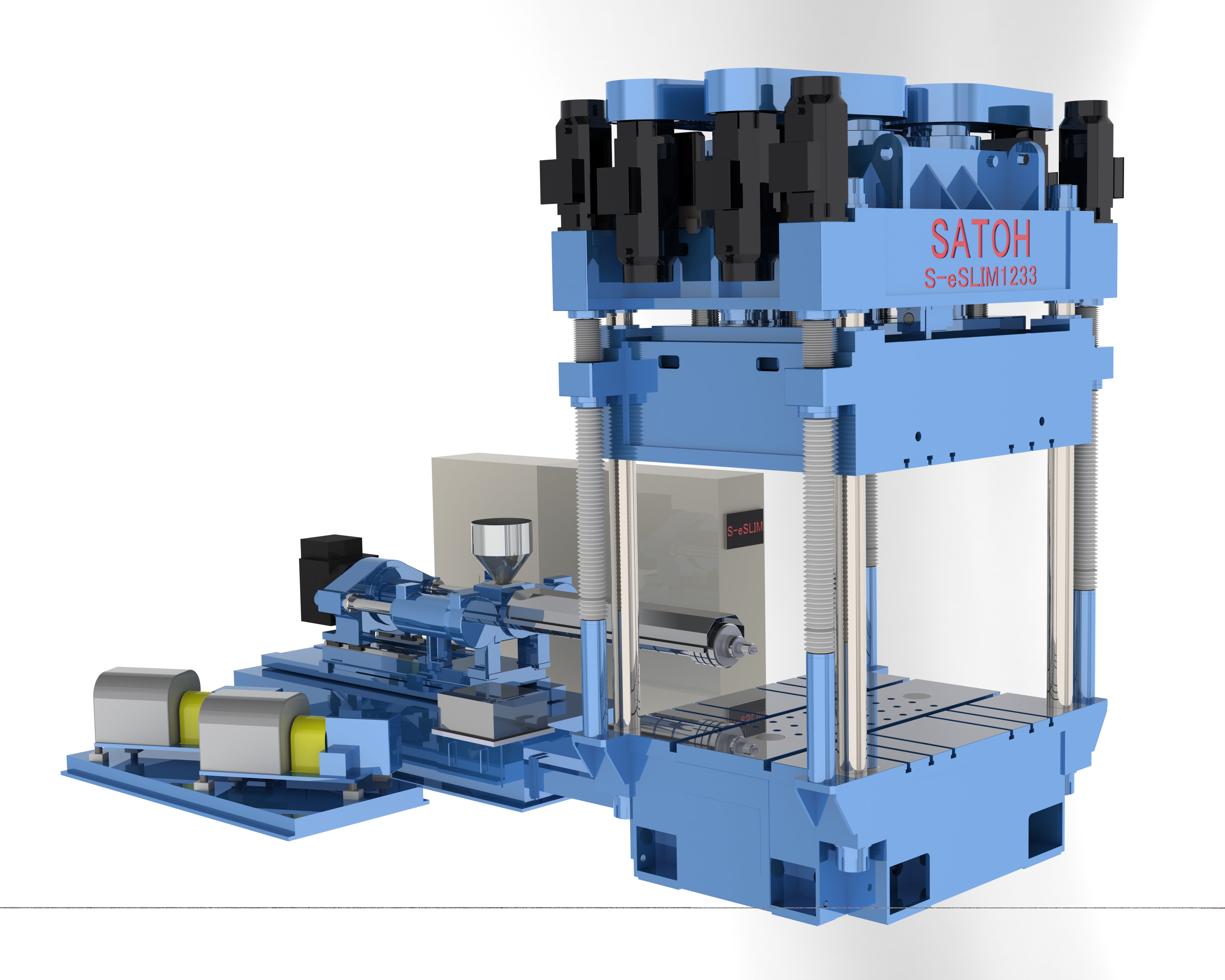 内容:縦型のプレスに射出装置を組み合わせた射出圧縮成形装置。射出圧縮成形の特徴(低圧・低歪)を生かした、大物の樹脂製品の成形や表皮一体成形が得意な成形装置です。