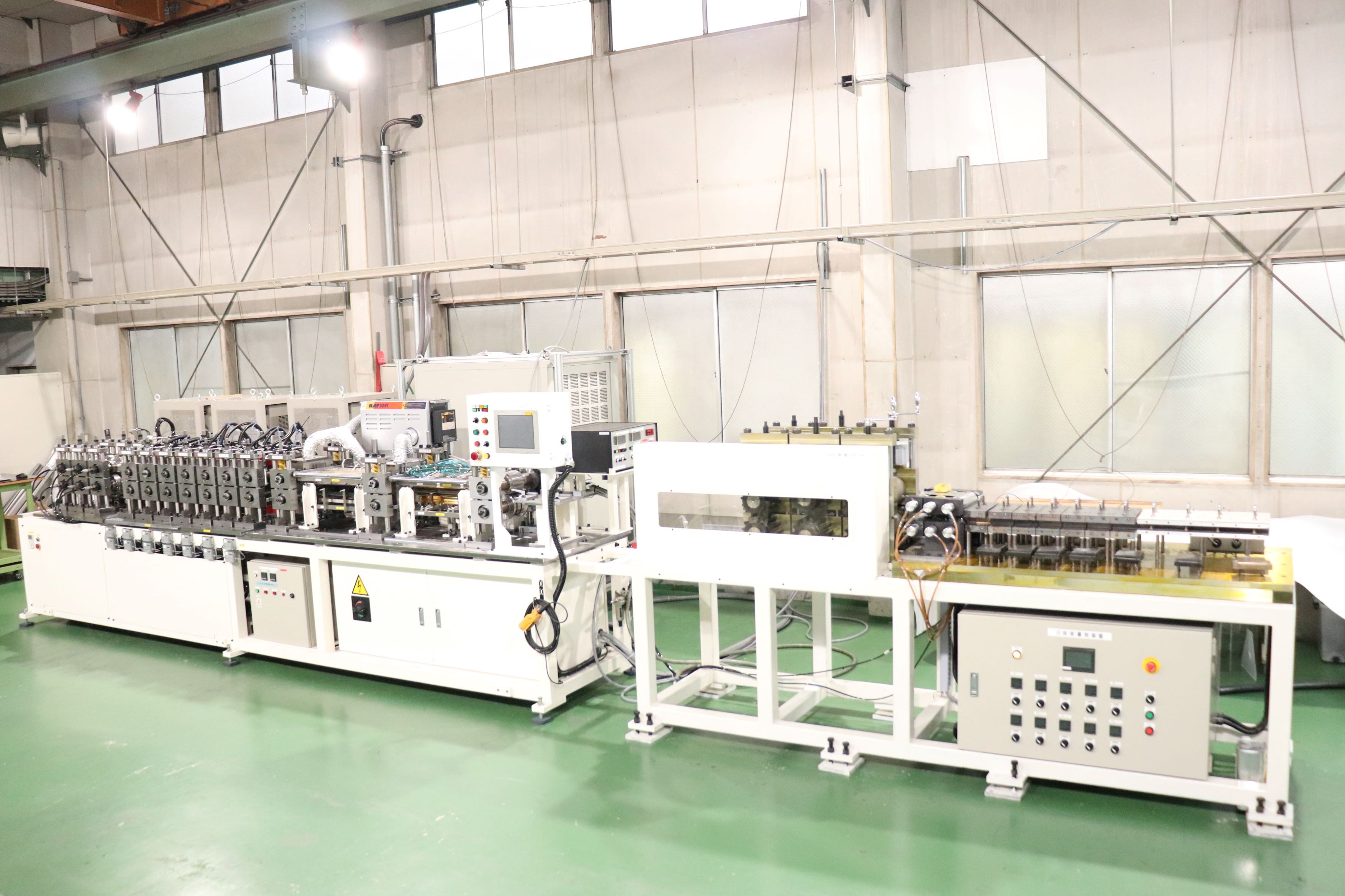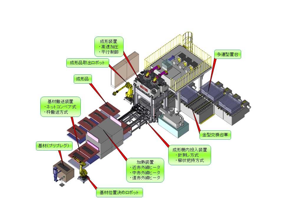 内容:成形装置に加熱炉やマテハン装置、製品取出し装置、金型交換装置や外周の安全柵・安全扉まで含めたシステムエンジニアリングが可能です。