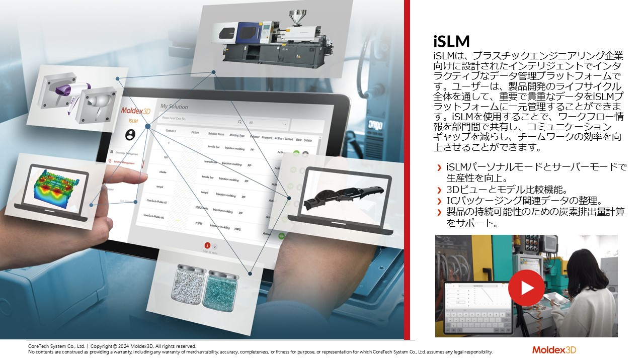 内容:Moldex3Dは、生産準備段階の情報から解析結果までのすべての製品開発段階の情報を、クラウド上で一元管理ができるプラットホームを提供します。部門間での共有やノウハウの蓄積、過去のデータ分析などの効率化を可能にします。