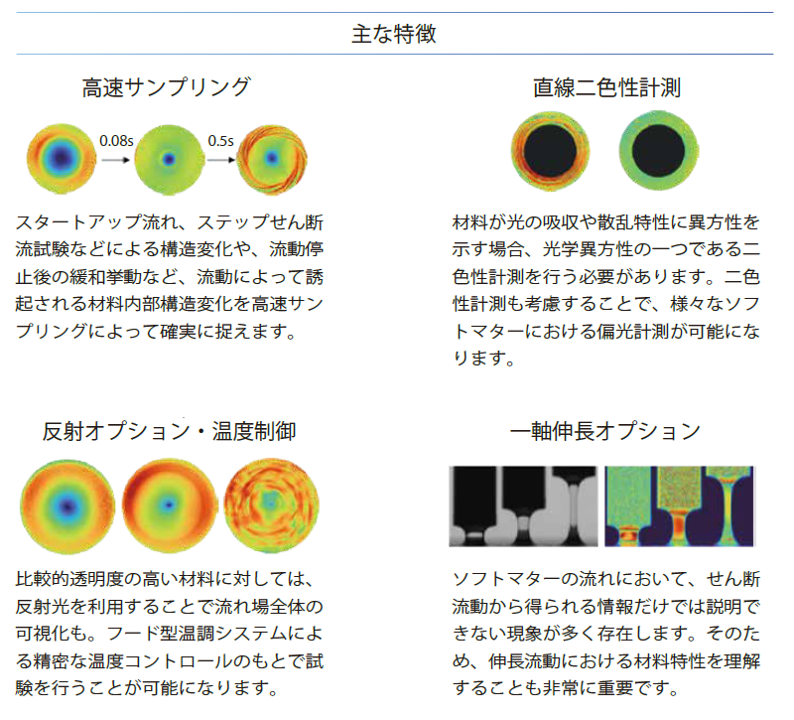このシステムでは、レオメータを用いた様々な物性データと、偏光ハイスピードカメラを用いた材料の内部構造の評価を同時に行うことが可能です。
