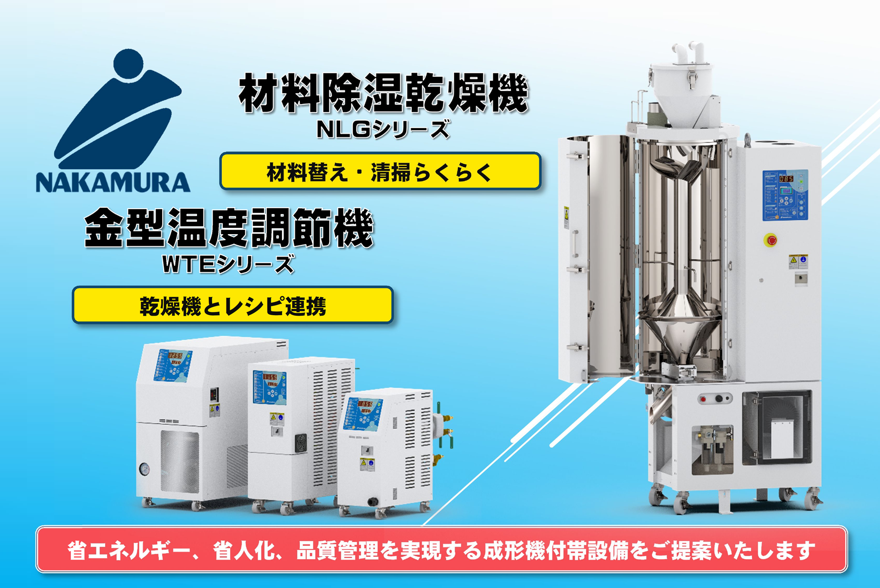中村科学工業株式会社は、愛知県岡崎市に本社をおく、プラスチック成形や次世代エンジン開発をサポートする産業機械メーカーです。プラスチック成形の合理化機器メーカーとして、材料自動輸送や、材料乾燥、金型温度のコントロールと言ったプラスチック成形に関する製品の開発から製造・販売までおこなっております。