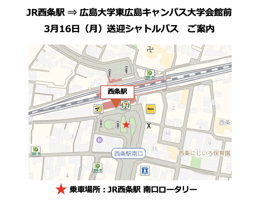 ※3/16(月)朝の西条駅→広島大学は混雑が予想されます。大会臨時バスも含めた時刻表はこちらを参照してくだい。